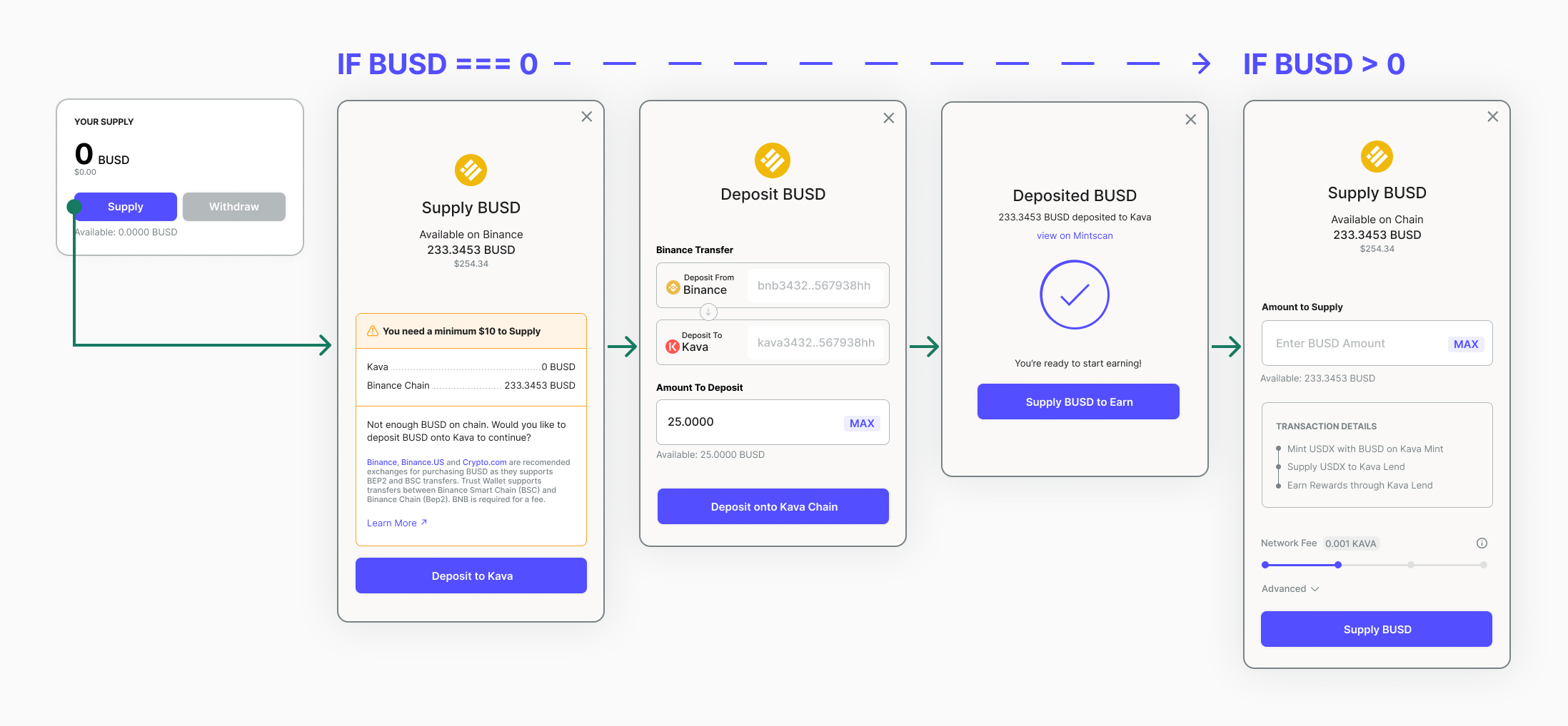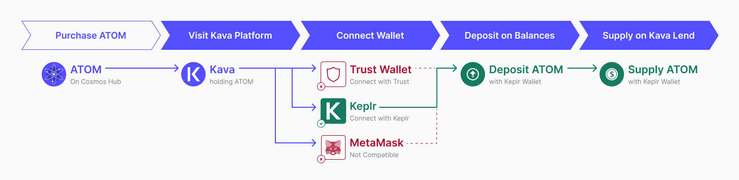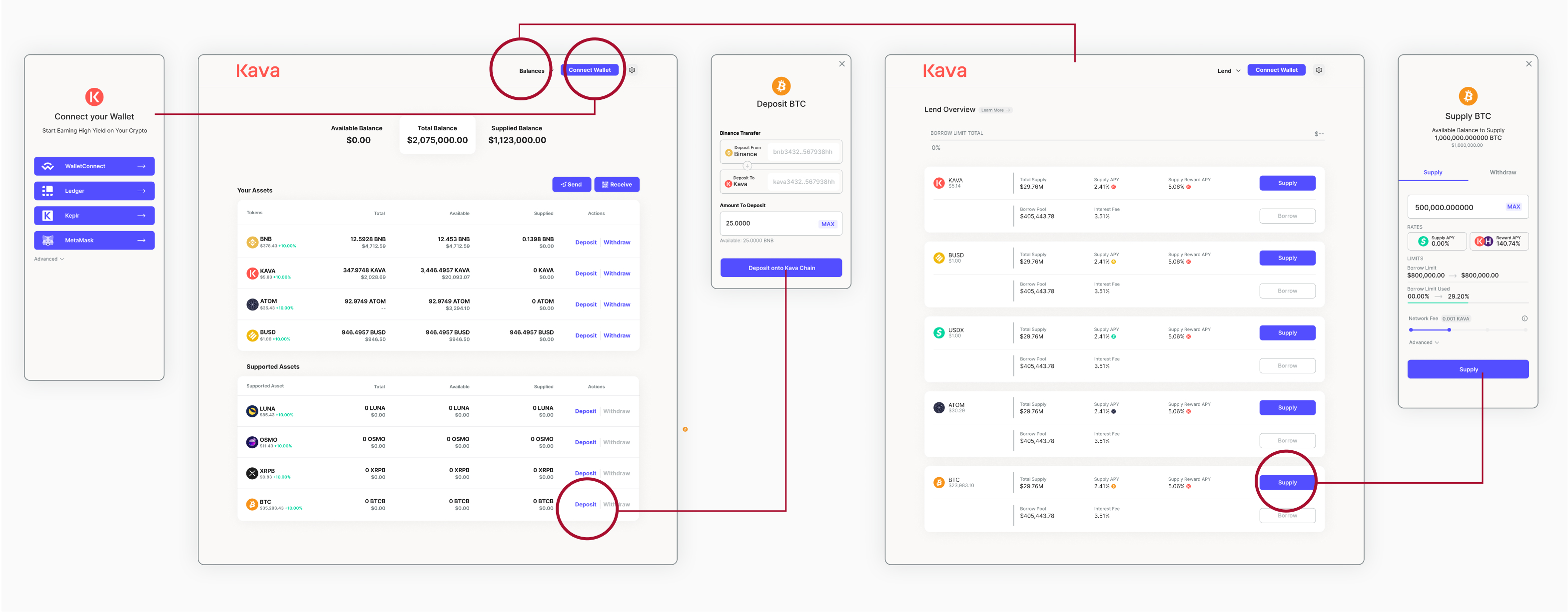 Even with the simplest use case of supplying to Kava Lend, users had to bounce between multiple pages and modals to then connect their wallet, deposit to the Kava blockchain and and supply to Lend.