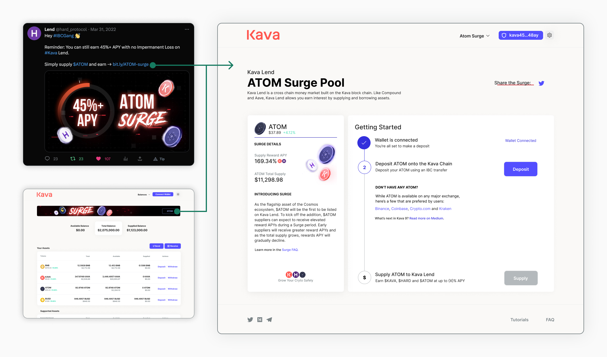 Marketing put together some great branding for the concept and launched twitter campaigns specifically targeting ATOM holders. Once users landed on the page, we reiterated the promotional value of the “Surge”, created clear steps for users to take supply ATOM to Kava Lend.