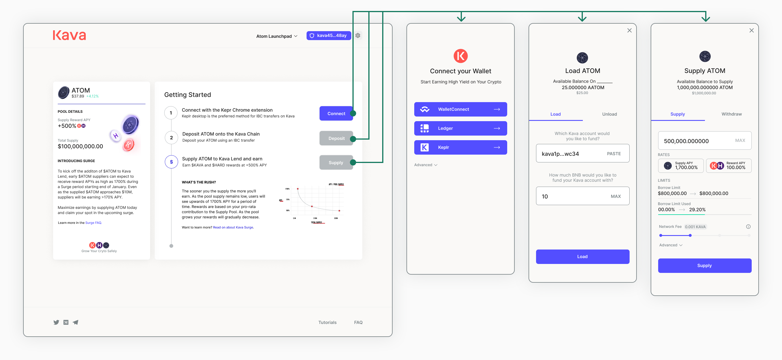 Rather then sending users out to the balances page and Kava Lend to complete the steps, we gave users the ability to take those steps without leaving the page by loading in the modals directly to this ATOM Surge Landing. It was a single place where user’s could learn about the Surge, Connect, Deposit, Supply and earn 200%+ on their ATOM.