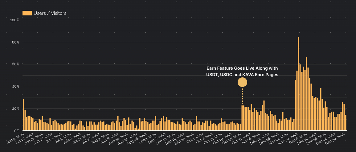 Things were working well with BUSD Earn, so during the next major release we launched 3 more strategies and built them into a more dedicated feature. KAVA, USDC and USDT. KAVA was a staking strategy while USDT and USDC both supplied to a new protocol called KAVA Boost. While the USDT, USDC and KAVA pages didn't take off initially, BUSD saw a big jump in usage.