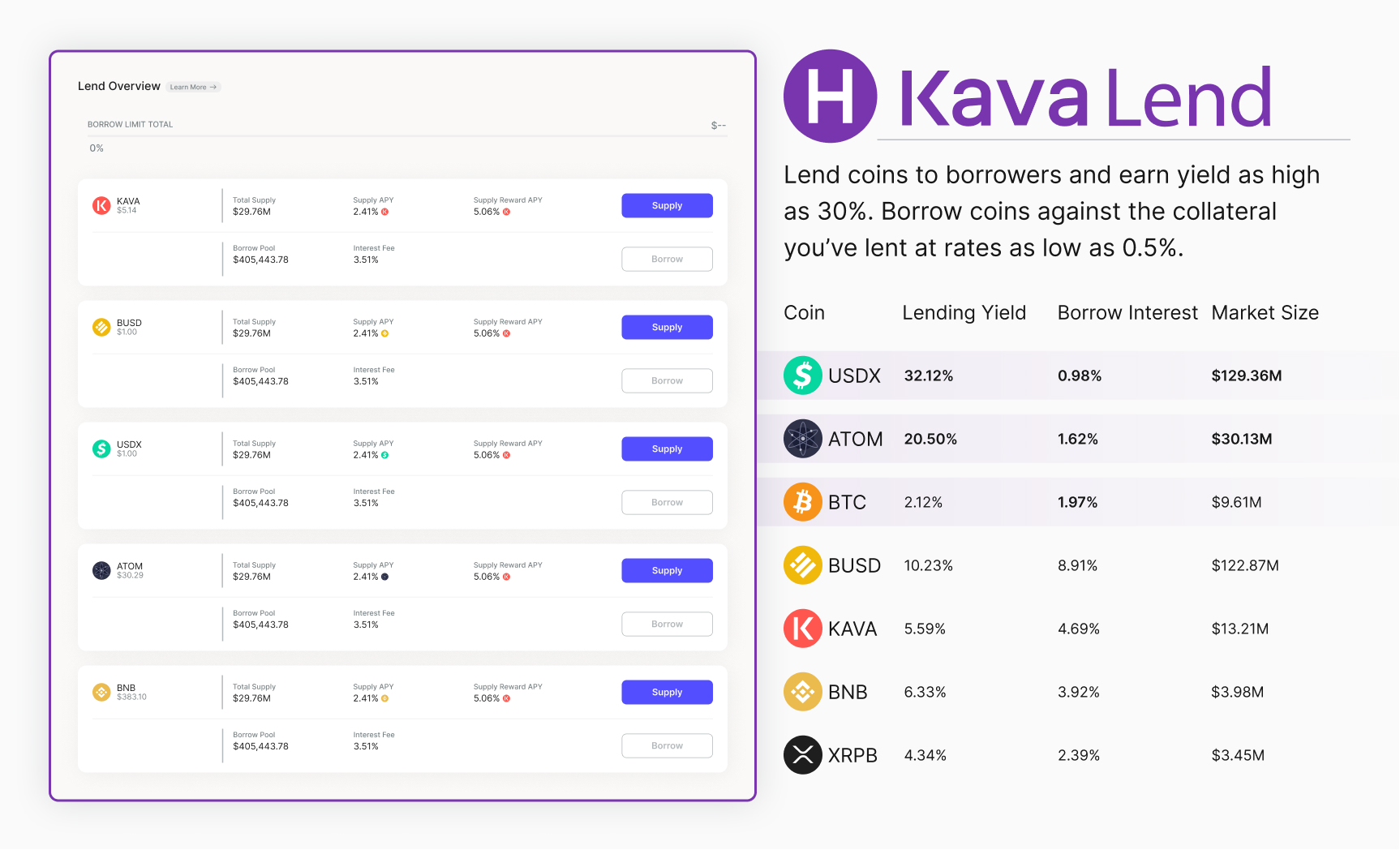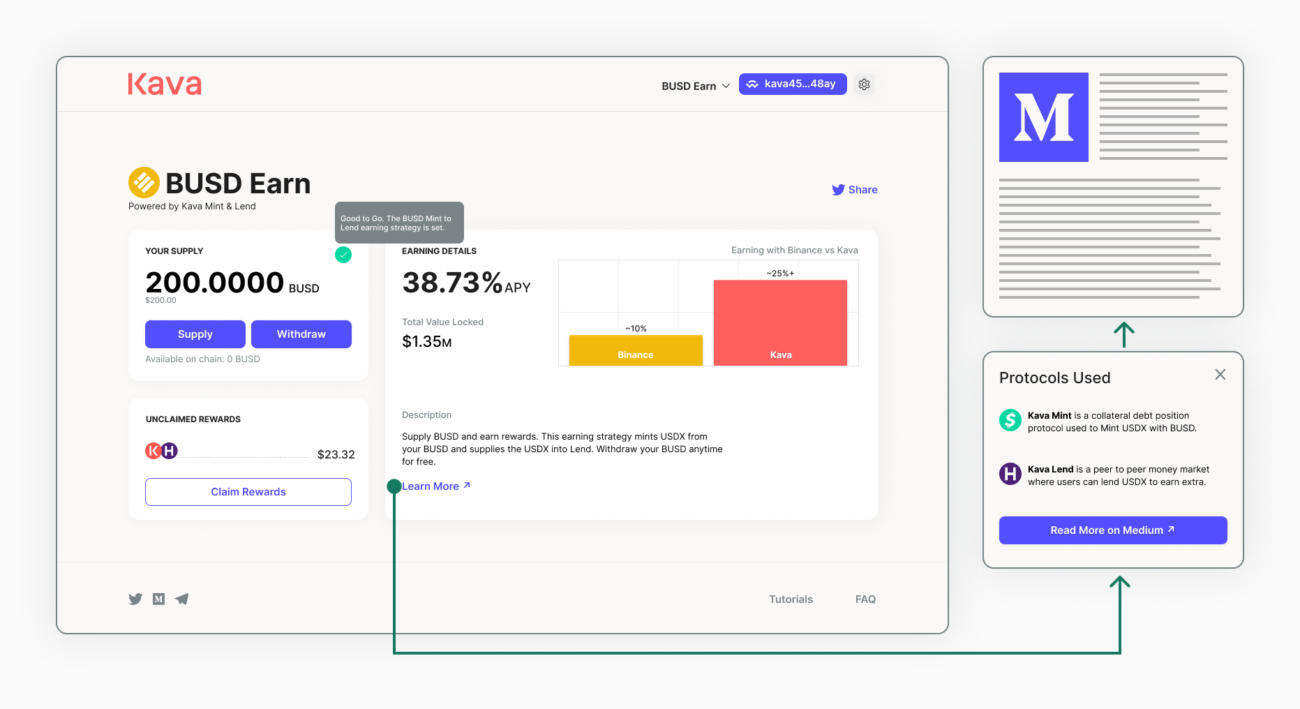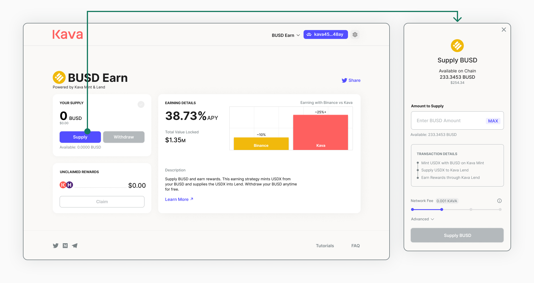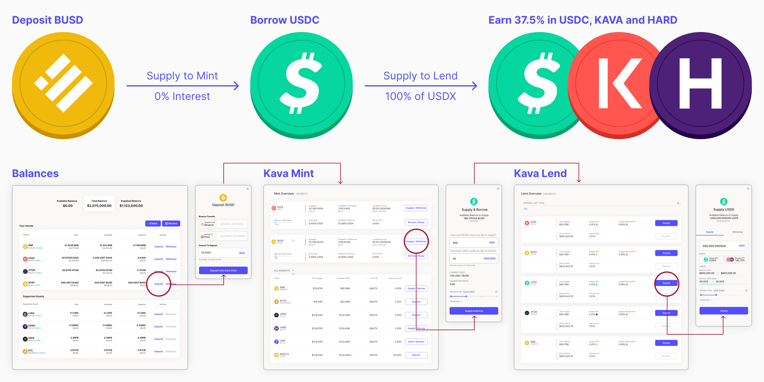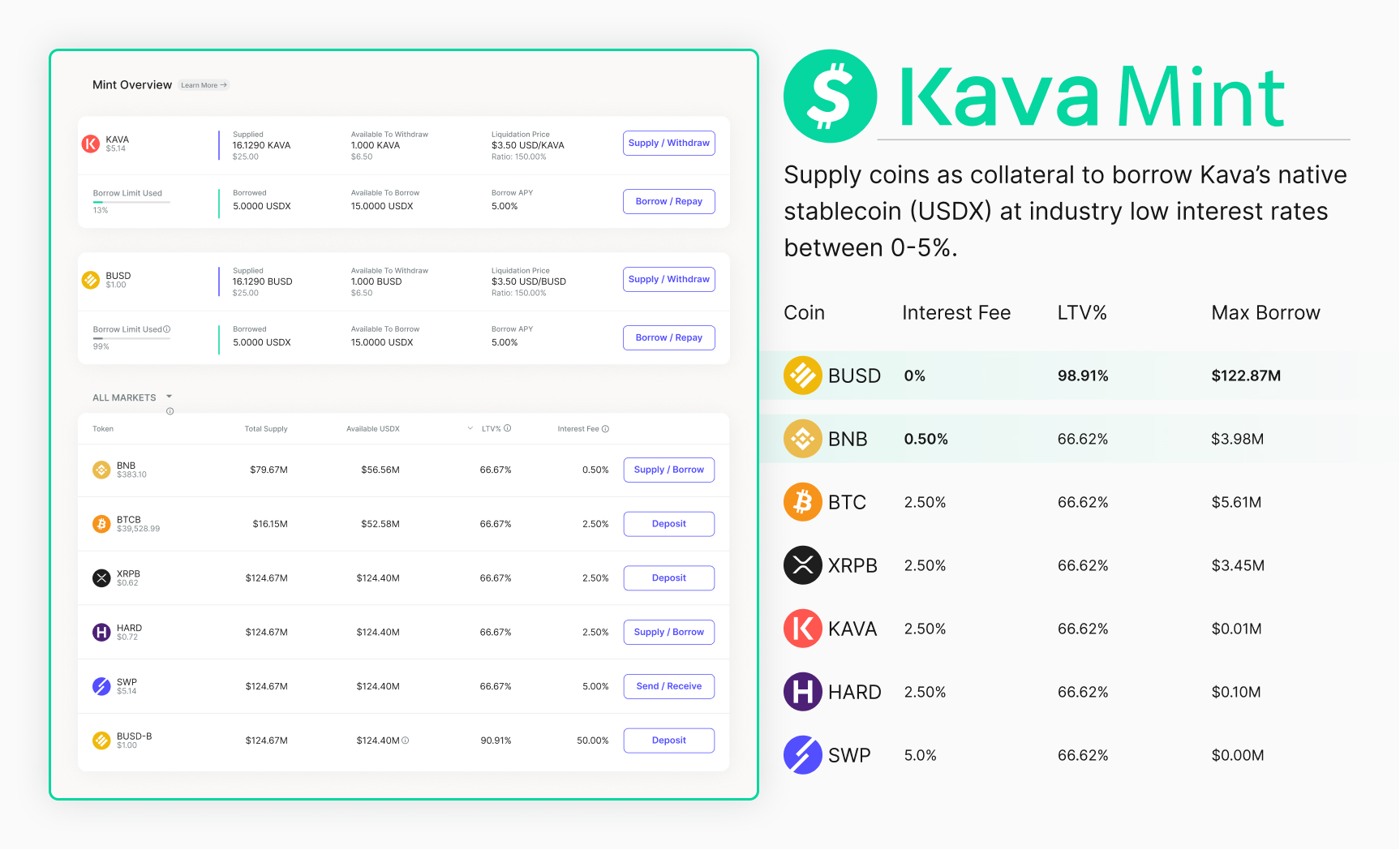 In this case, users supplying BUSD to Kava Lend would earn 5% (which was inline with other Lending products), but if a user used their BUSD to borrow USDX on Kava Mint at 0% interest and a 99% loan to value ratio, then supplied that USDX to Kava Lend, they would earn 20%+ through the USDX money market on Kava Lend.