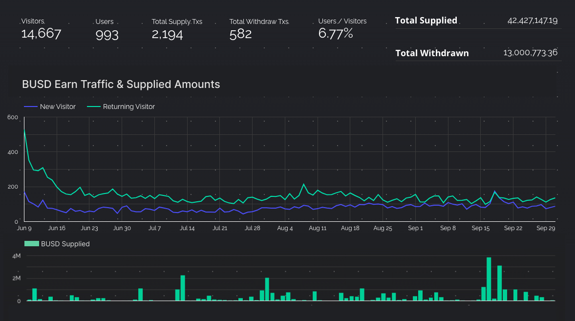 Usage was promising. In the first few months over 40 million BUSD had been supplied and usage was consistent. Conversion rates for this BUSD Earn page didn't get to the levels of the surge pages, but still outperformed the baseline at a good rate by 25%.