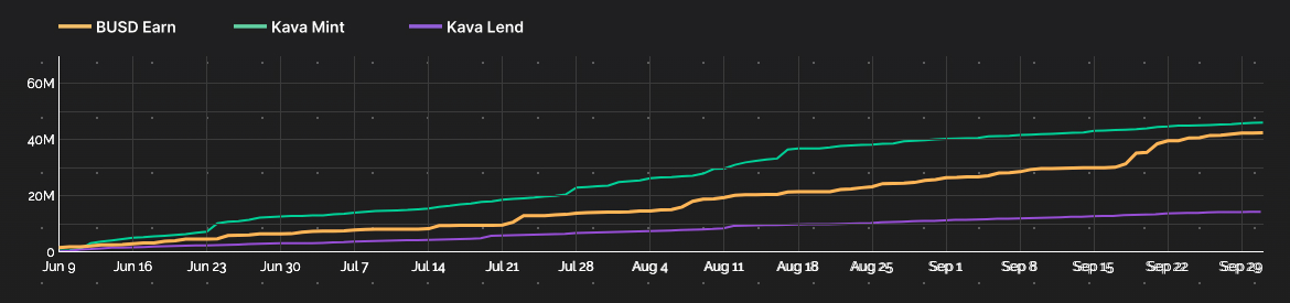 Right from the start, BUSD Earn was a competitor for the number one source of BUSD being supplied to the app. It the cumulative amount supplied trailed Kava Mint, but it gaining.
