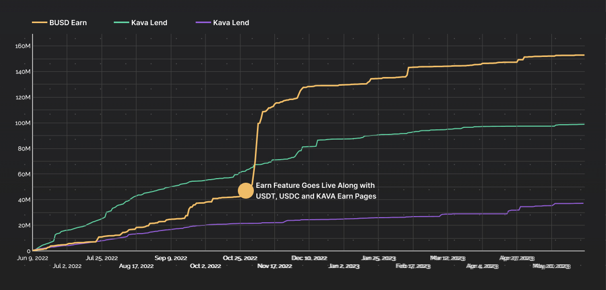 As soon as we started adding more strategies and building this concept into a larger feature, adoption immediately started taking off. vAll in all, we tracked over 130 Million supplied to the BUSD Earn page and over 40 million supplied to the KAVA Earn page.