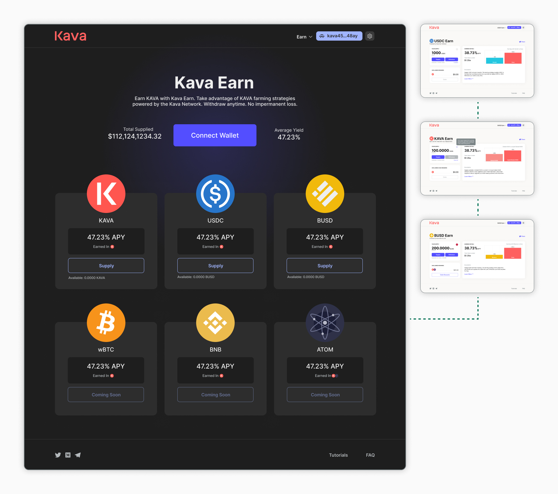 There was enough success with BUSD Earn to expand on the idea and setup Earn pages for new assets. During the next major release we launched 3 more strategies and built them into a more dedicated feature. KAVA, USDC and USDT were the new asset pages.