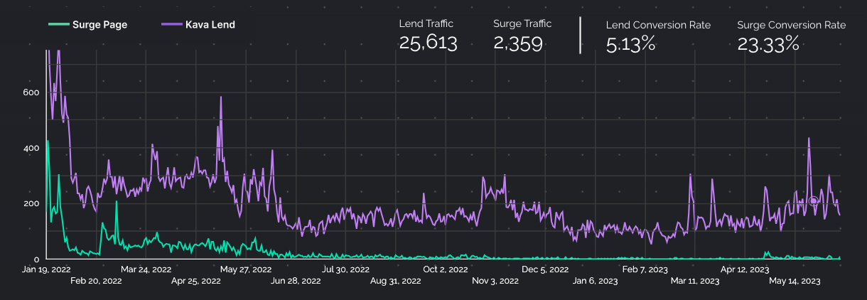 As the other pages were added within the Kava Earn feature, the conversion rate for BUSD Earn started taking off too. Now the page was starting to see similar conversion rates to that initial surge page. It seemed like building out other Earn pages into a larger feature really helped build trust around the concept as a whole.