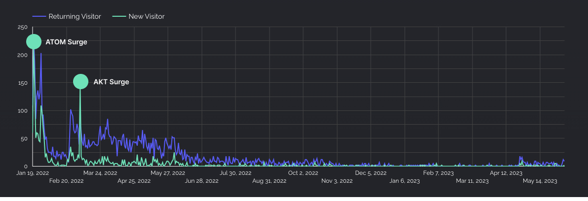 How many people visit the app and feature. Serves as a measure of how interesting the value prop is, how much interest we can generate with holders of specific assets.