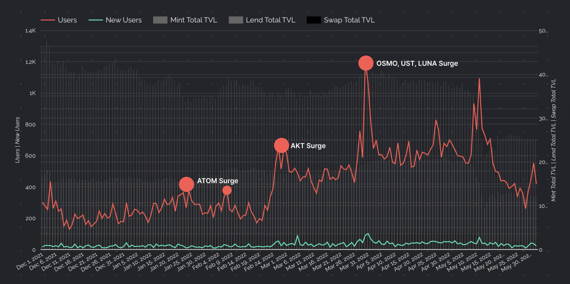 The total value of the assets supplied. Our top line company metric and the overall goal of the product team; increase TVL. This metric was dimensioned in the same way as users to better determine which parts of the product were most valuable.