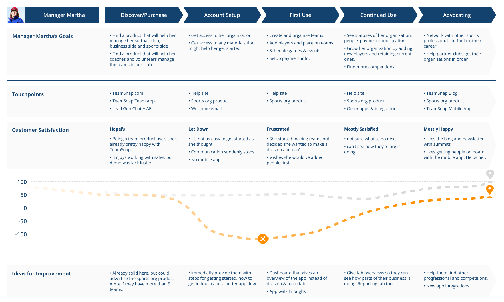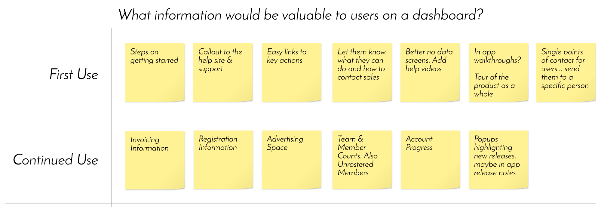 However, a dashboard can consist of a lot of things and provide a lot of detail into many things, so I added one more cross department brainstorming session so we could dive more into specifics of content & functionality to include at different stages of the customer journey.