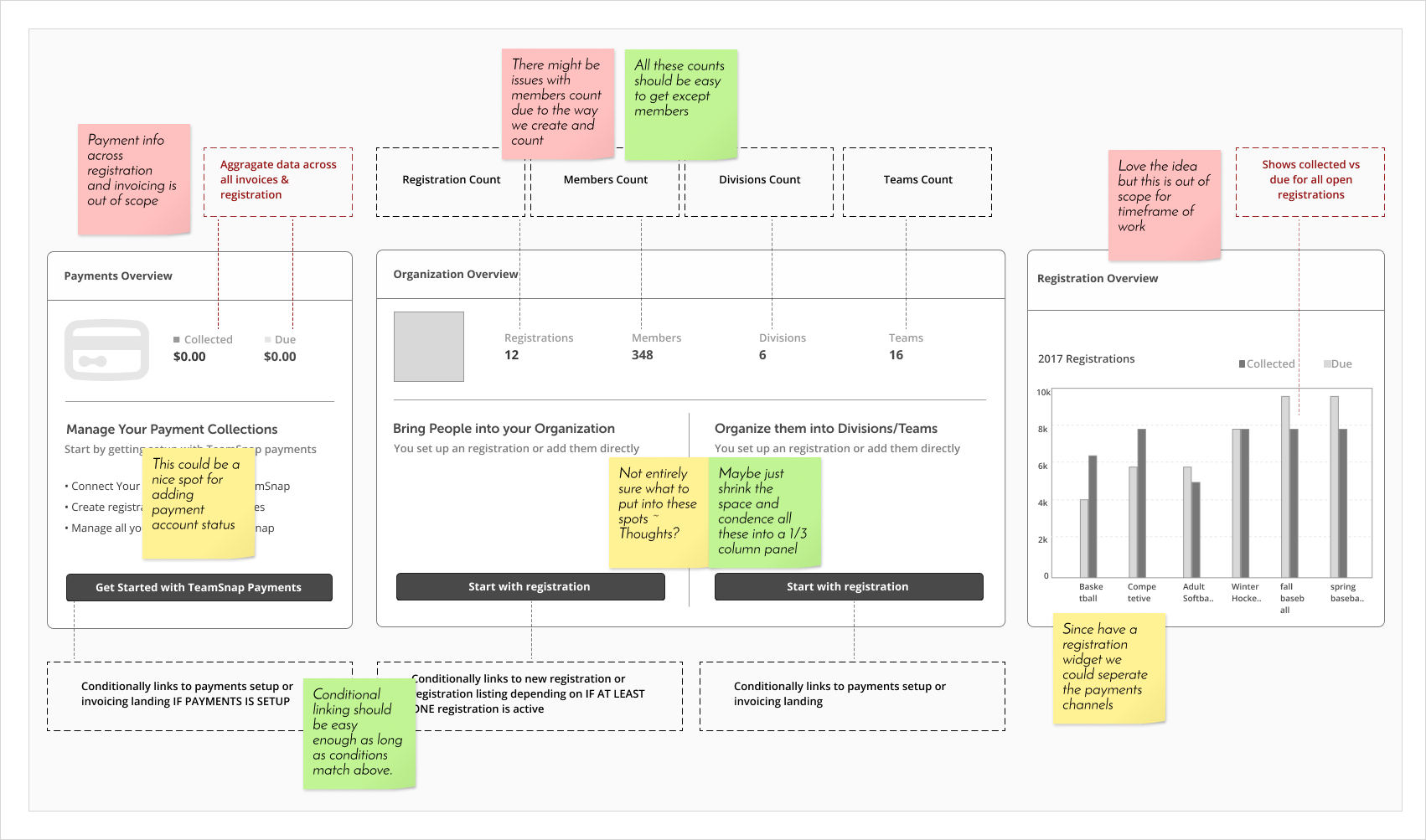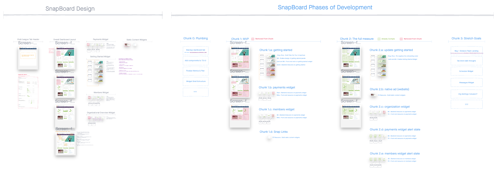 Throughout this whole project we really tried to anchor design decisions and component states to the customer journey, both in each individual component and the dashboard as a whole. The week of development was no different. All the parts and pieces we're outlined and divided up to various team members based on skill set.