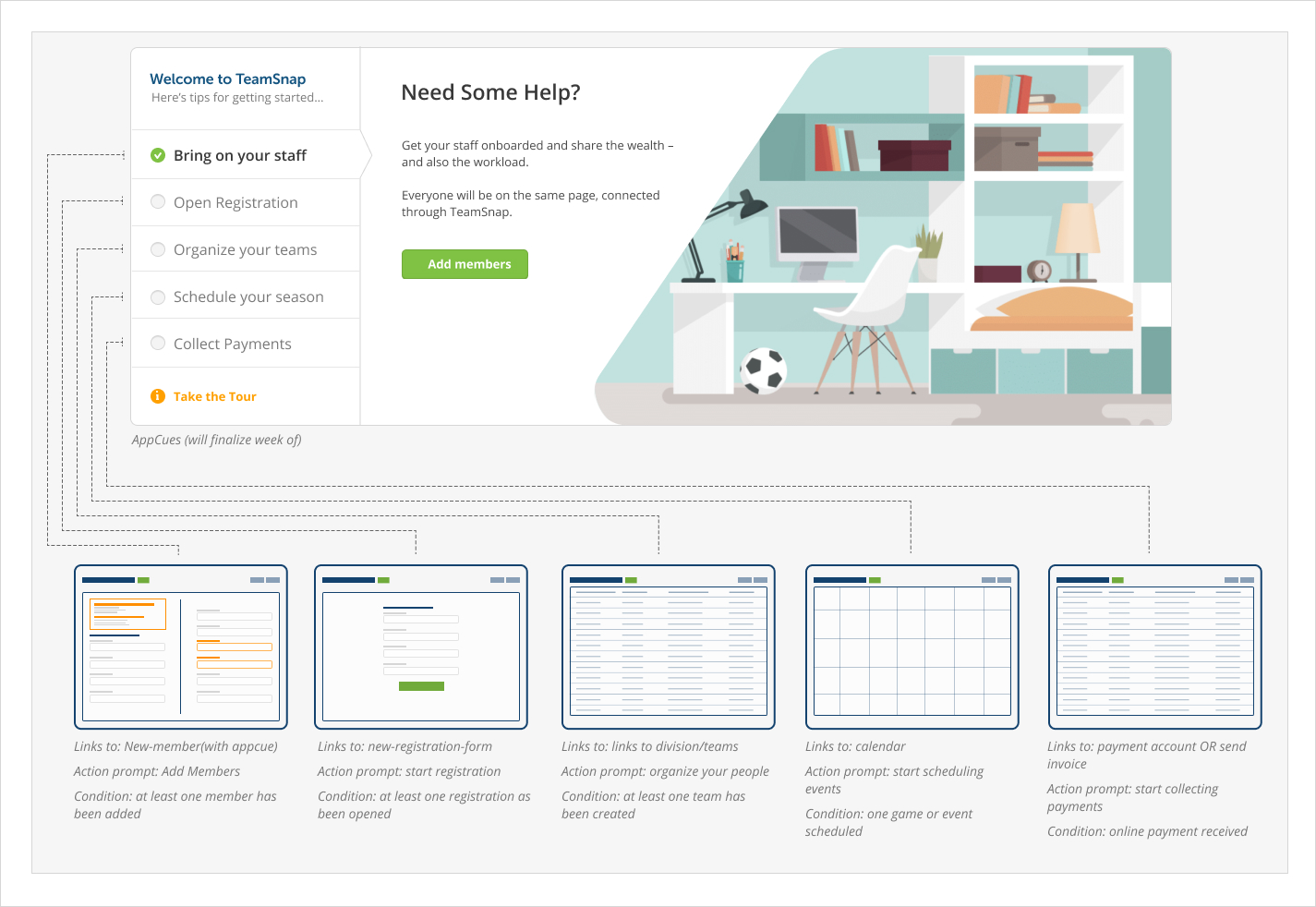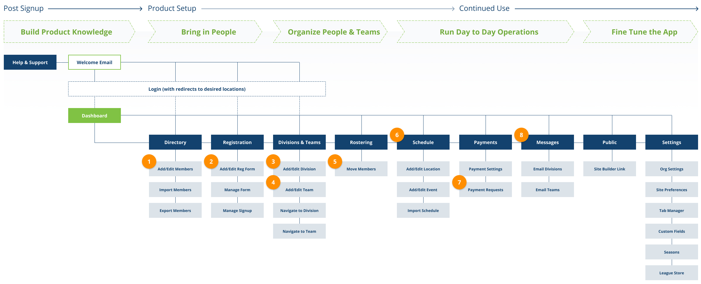 - Also when ranking the key tasks for user success, they’re very scattered through the products tab order and don’t necessarily follow a common order for setting up a sports organization.
