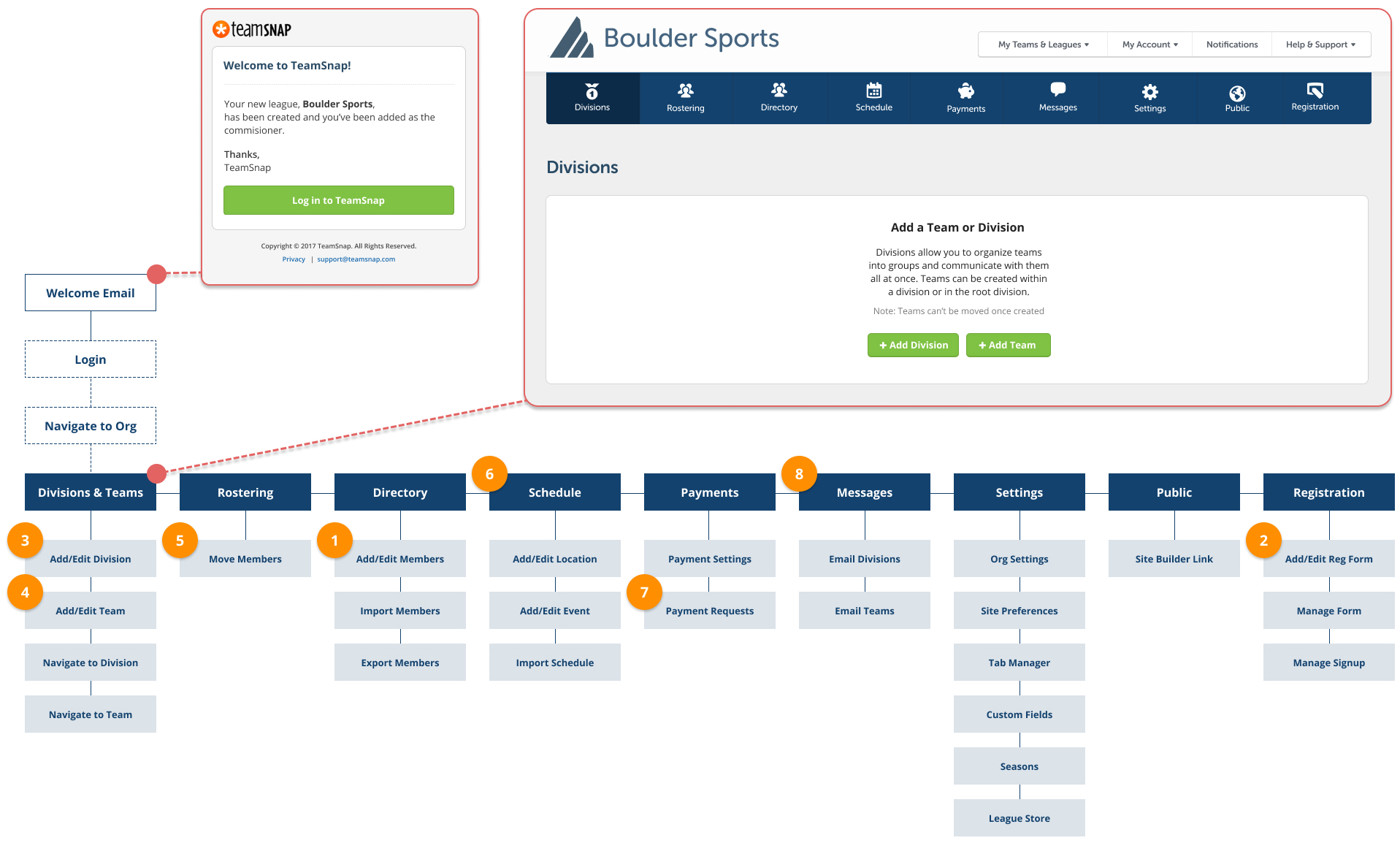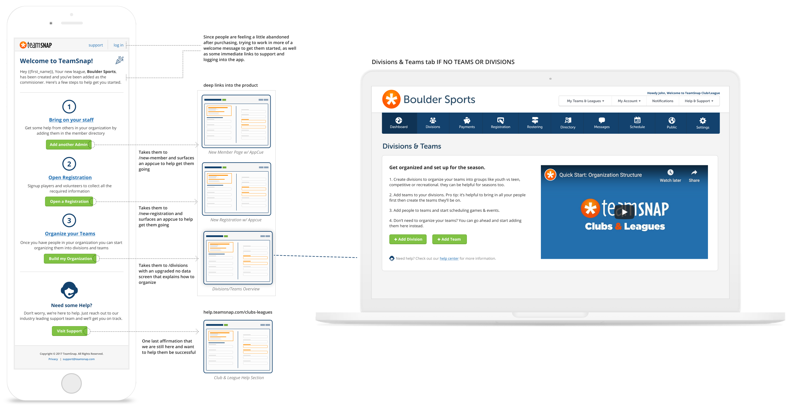 - There was little to no info in the welcome email and their first screen when after navigating to their org is a choice to add a team or division, which we know isn’t necessarily a choice they can easily make off the bat.