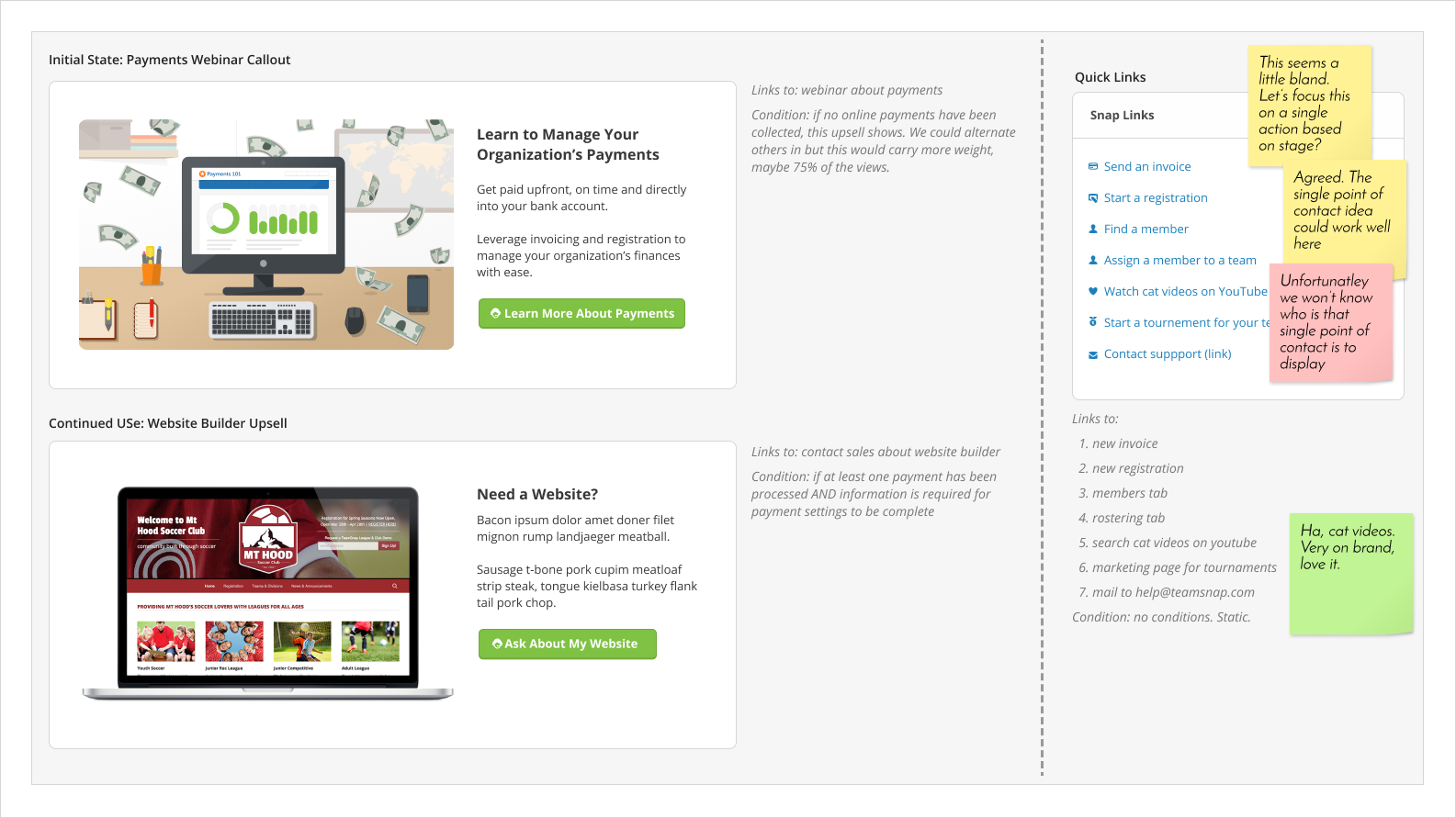 I then took those ideas and started mocking up how they might work in a set of componentized widgets. Below are a just a couple examples. We went through a process of vetting scope on a handful of ideas, talking through endpoints that would be required, ones we already had and level of difficulty in the new ones that were needed.